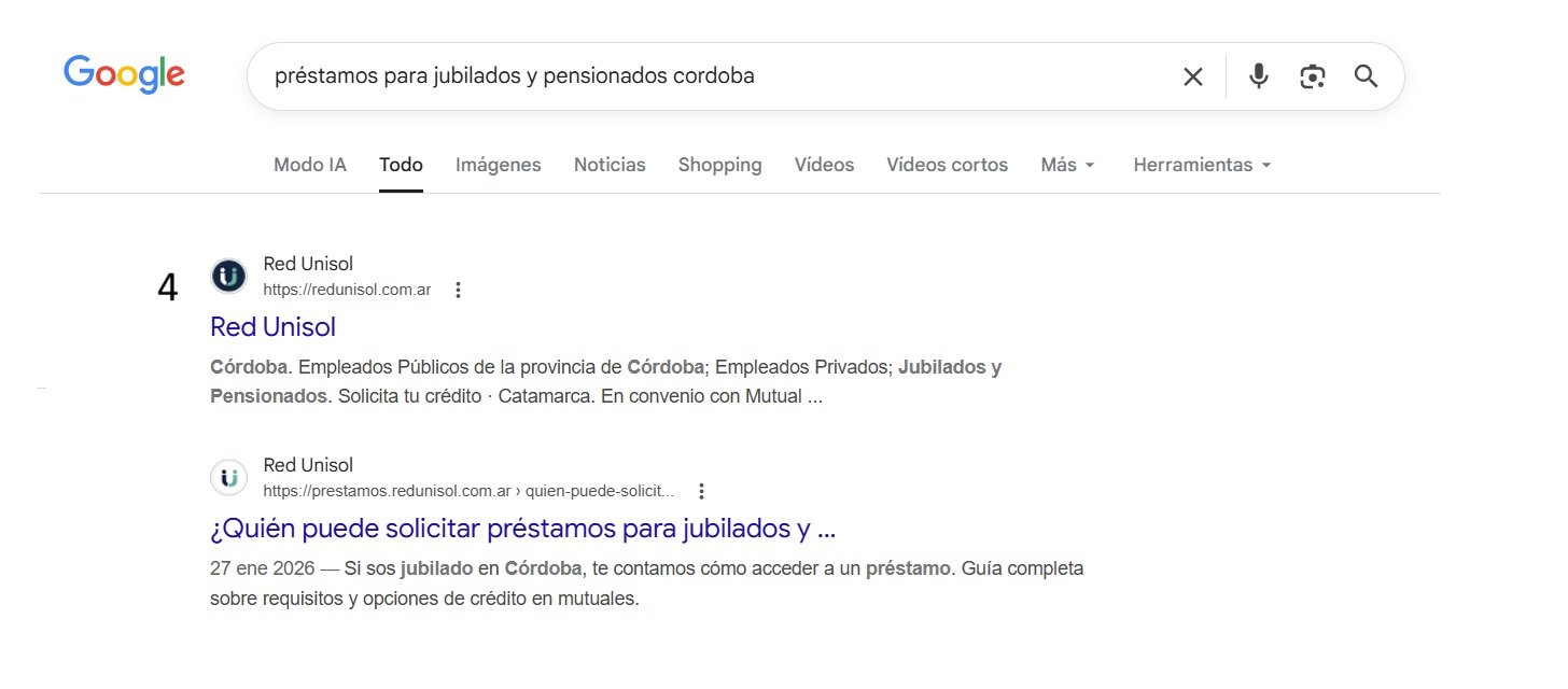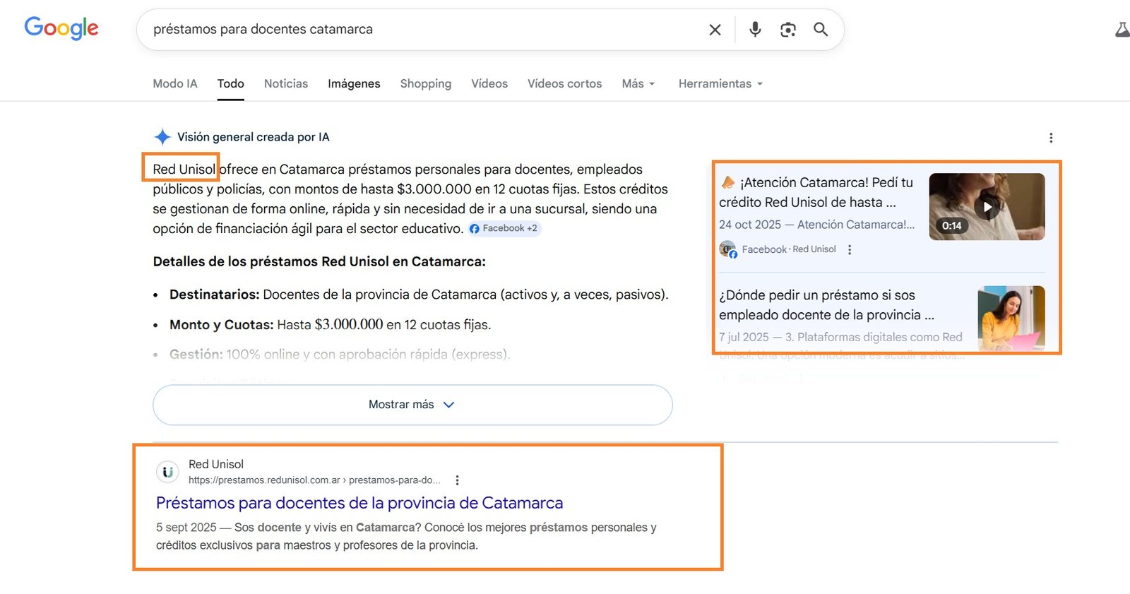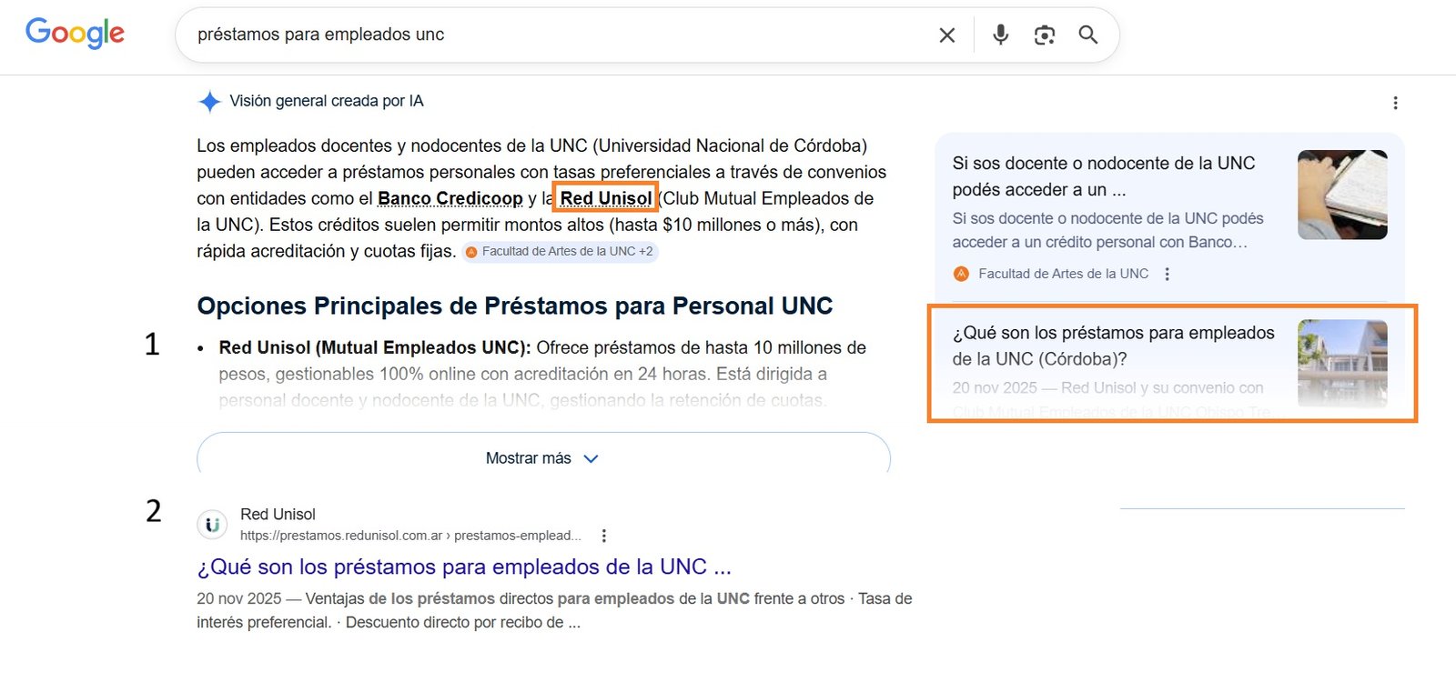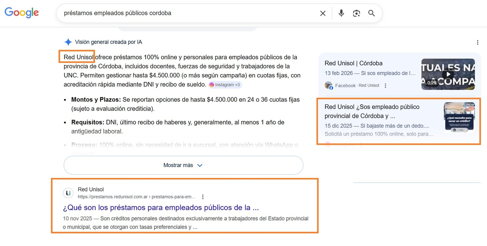 • La presencia de Red Unisol en resultados enriquecidos, Google IA y motores generativos como ChatGPT y Gemini refuerza su posicionamiento como referente en préstamos para empleados públicos provinciales, validándola como una opción segura y confiable ante las consultas de los usuarios.